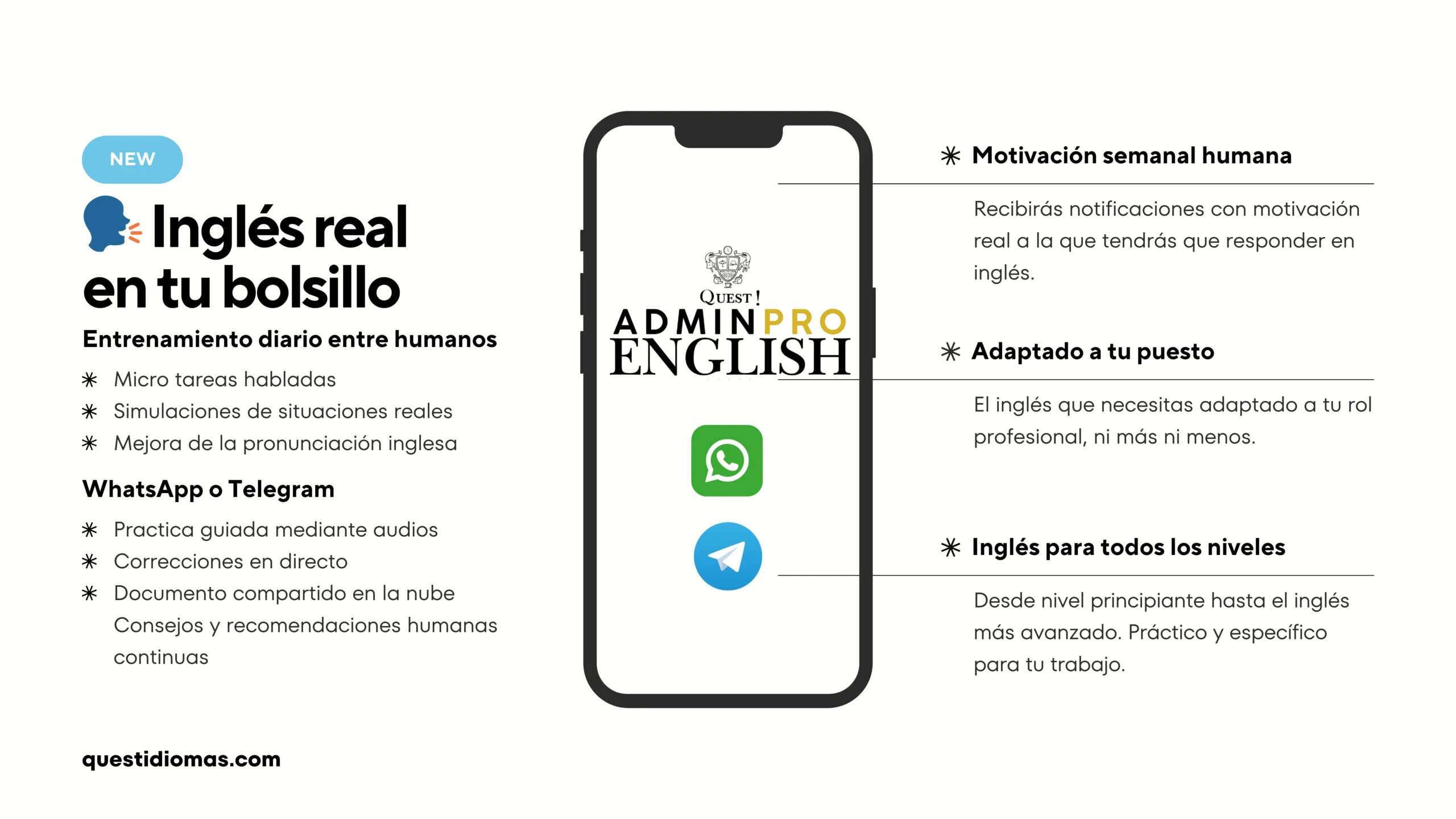 Aunque la modalidad que mejores frutos da en Quest! siempre será la presencial, la nueva modalidad mediante notas de voz de WhatsApp o Telegram, AdminPro English es una forma de entrenamiento personalizado de humano a humano que permite total flexibilidad y alivia la carga que supone tener que acudir a sesiones regulares online o en un lugar físico.