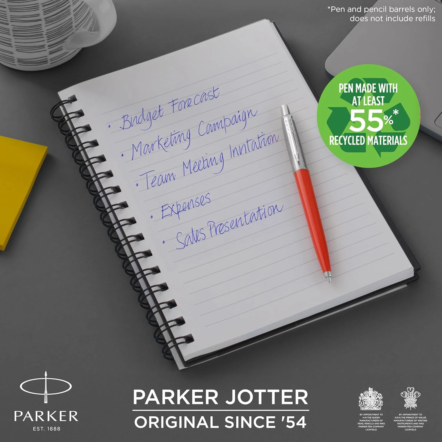 Los cuerpos de los bolígrafos y del portaminas están fabricados de forma responsable, con un 55 % de materiales reciclados*, reflejando el compromiso de Parker con la sostenibilidad.