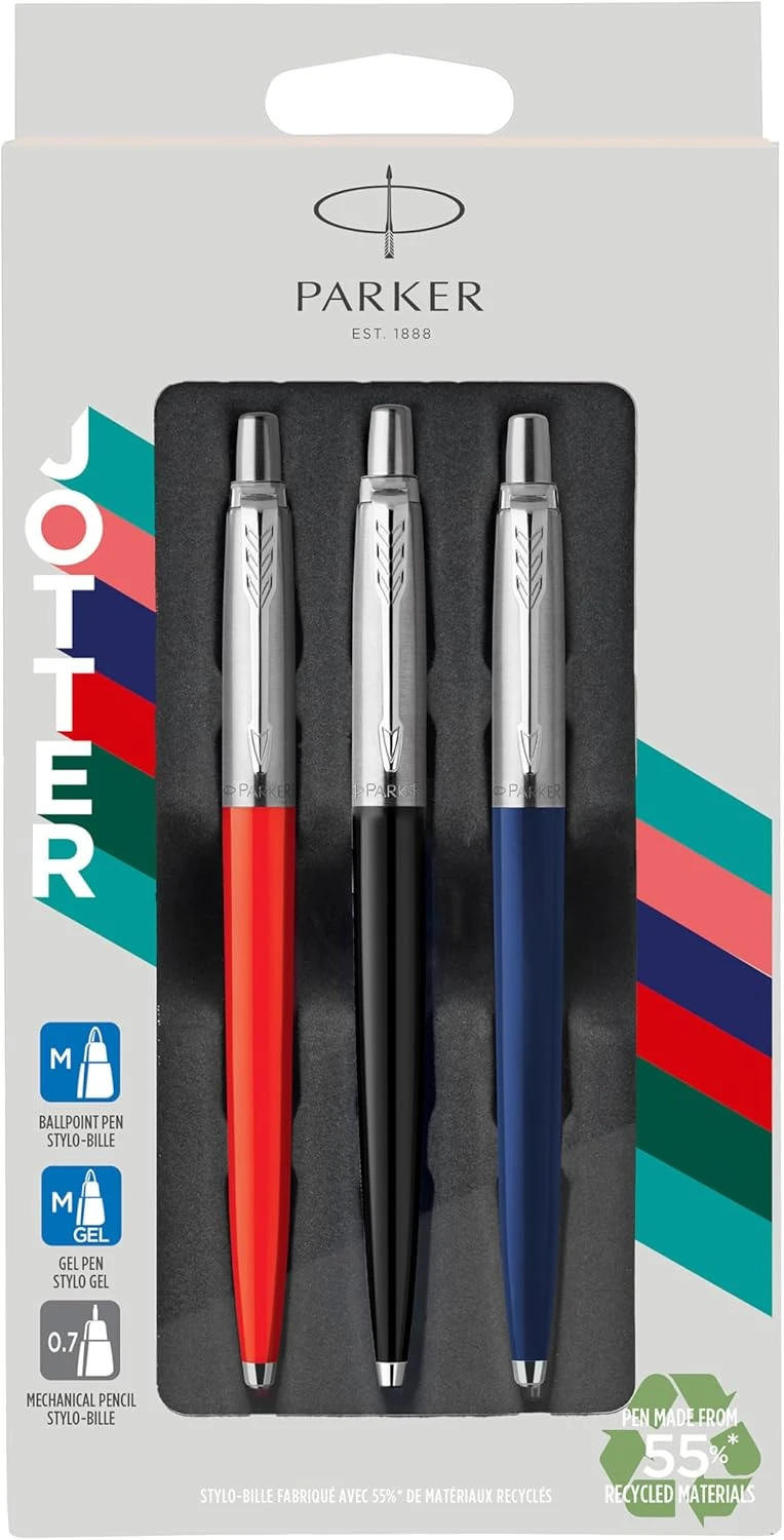 Este set de regalo Parker Jotter Originals incluye un bolígrafo de gel (0,7 mm), un bolígrafo de tinta (0,7 mm) y un portaminas (0,5 mm), siendo el obsequio ideal para estudiantes y jóvenes profesionales que buscan el compañero de escritura perfecto.